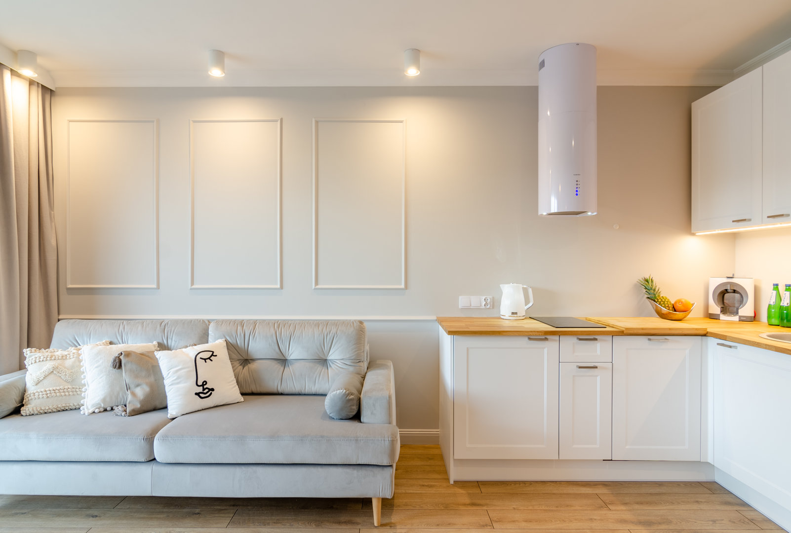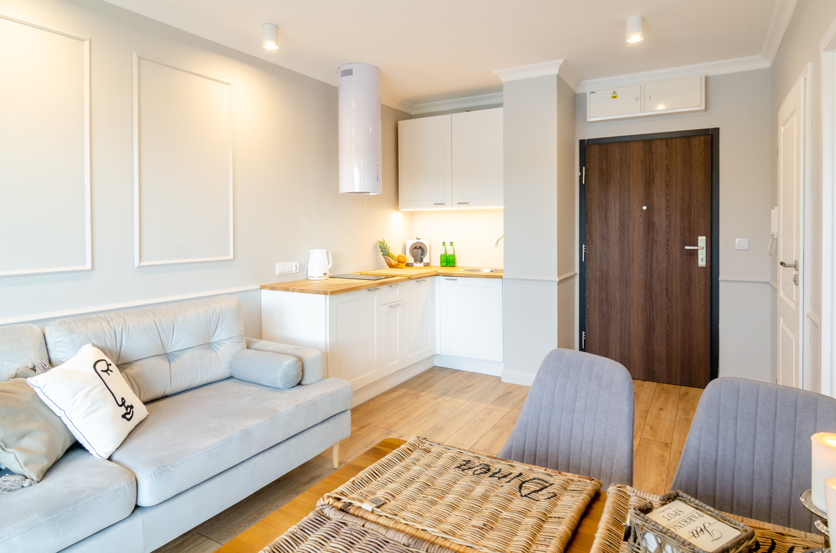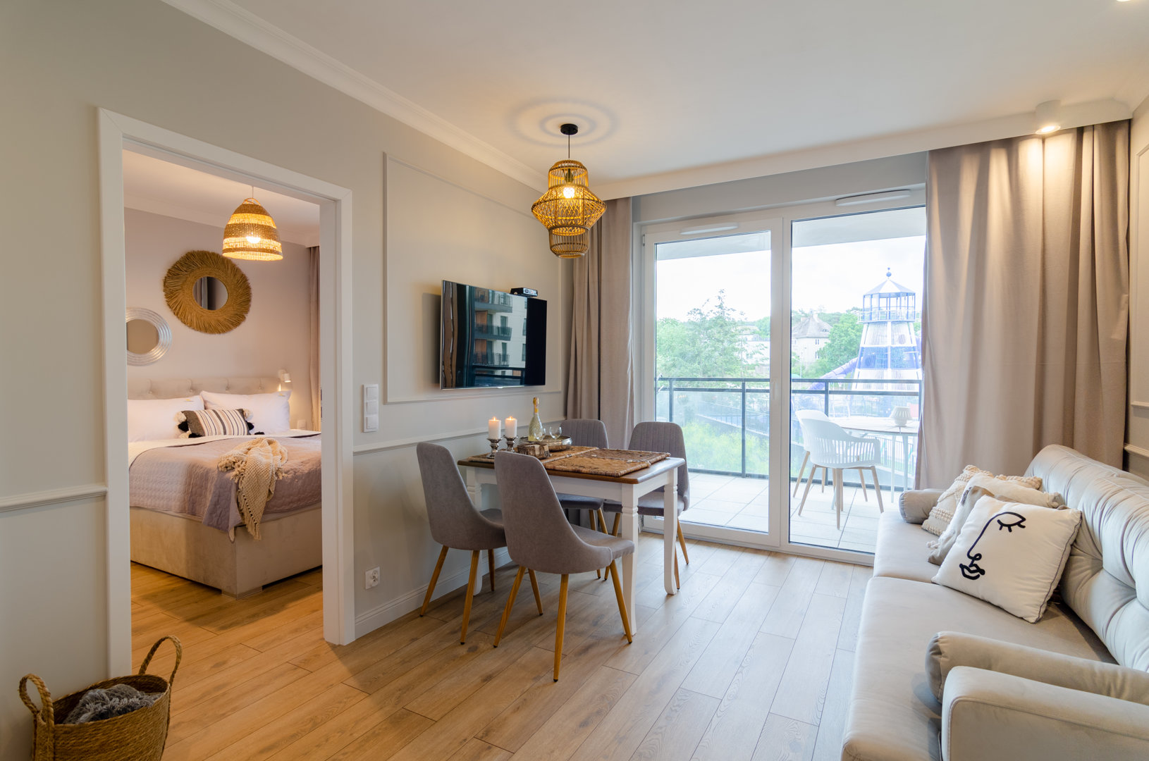 Apartament z osobną sypialnią, aneksem kuchennym i balkonem przy plaży