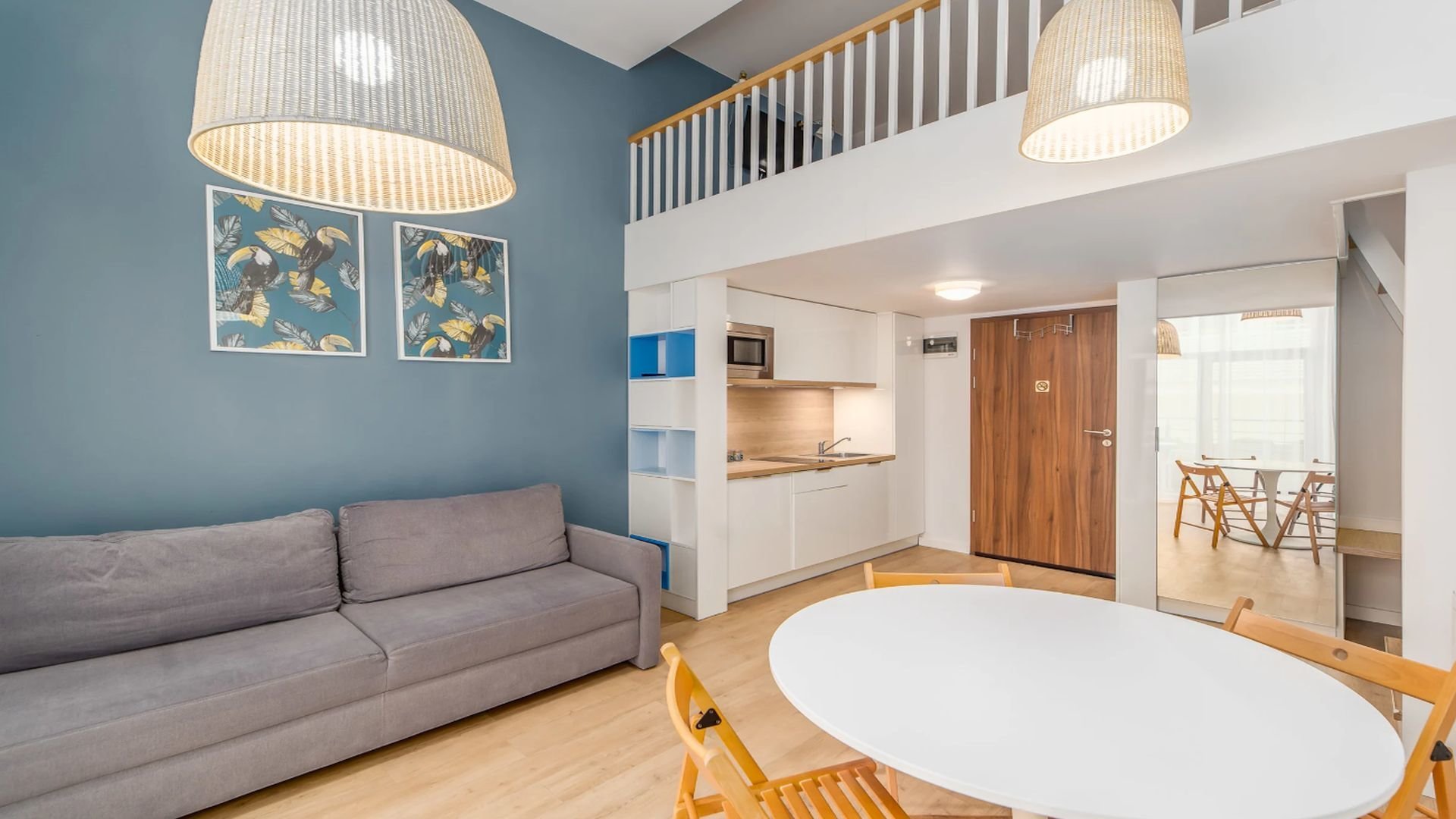 Dwupoziomowy apartament z dwoma sypialniami, dwoma łazienkami i dwoma balkonami