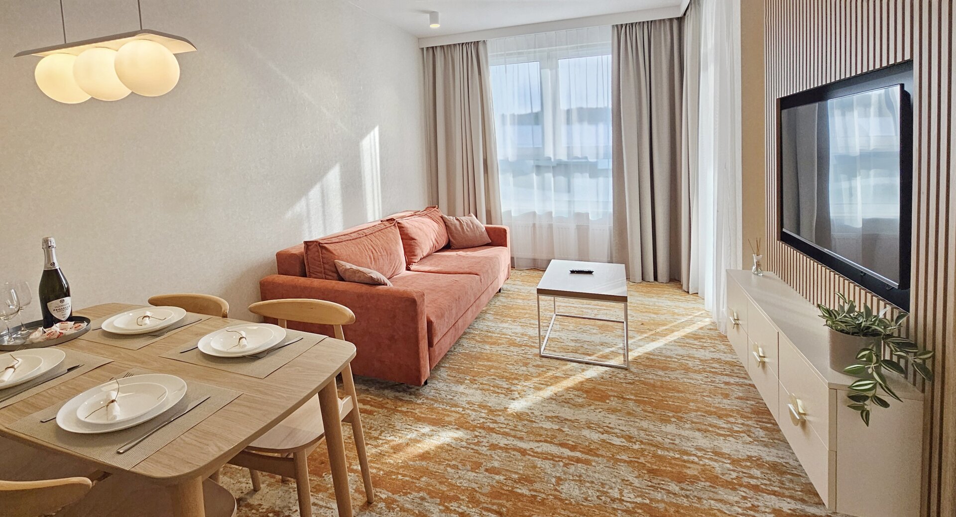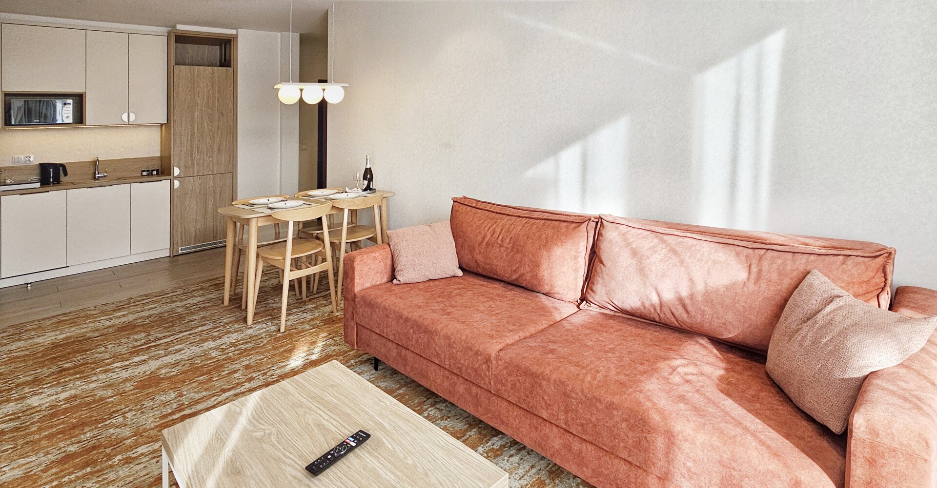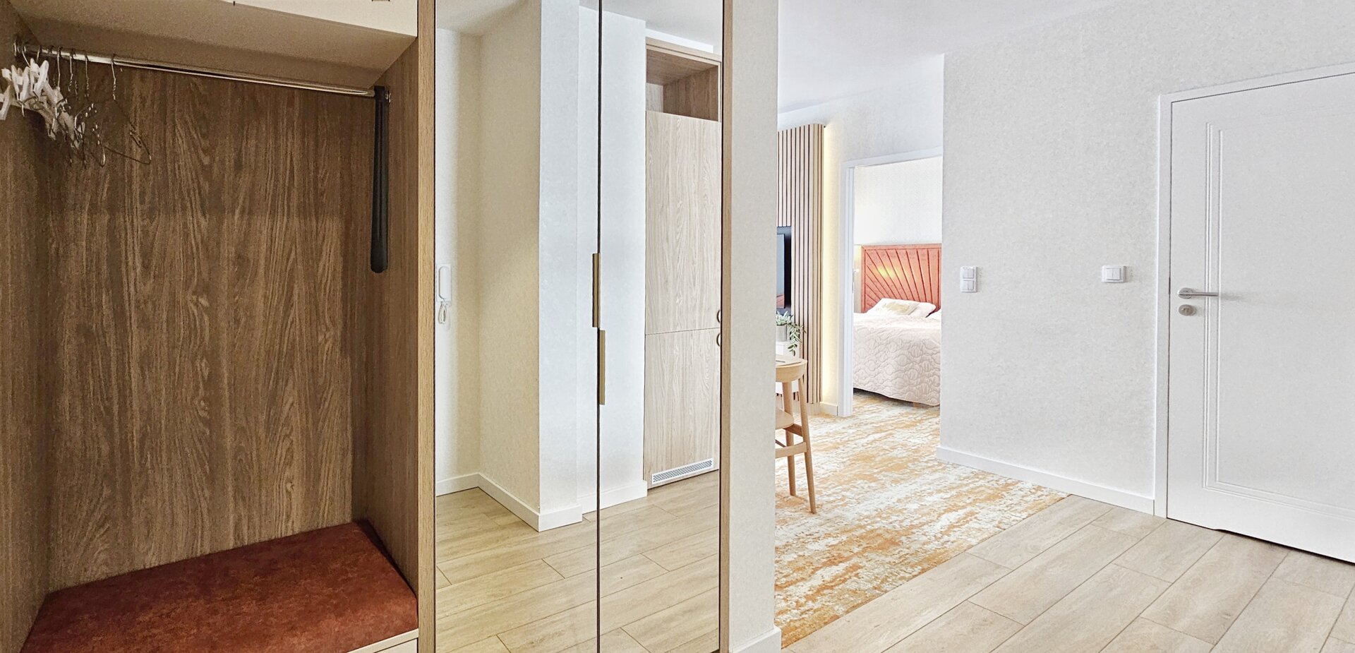 The apartment was designed with maximum comfort of its guests in mind. In a separate bedroom there is a spacious double bed, ensuring a comfortable sleep all night long, and a wardrobe where you can conveniently store your things. In the living room there is a sofa bed, which easily transforms into an extra bed, creating a spacious relaxation area. The living room is also equipped with a table and chairs, ideal for shared meals or spending time with family and friends.