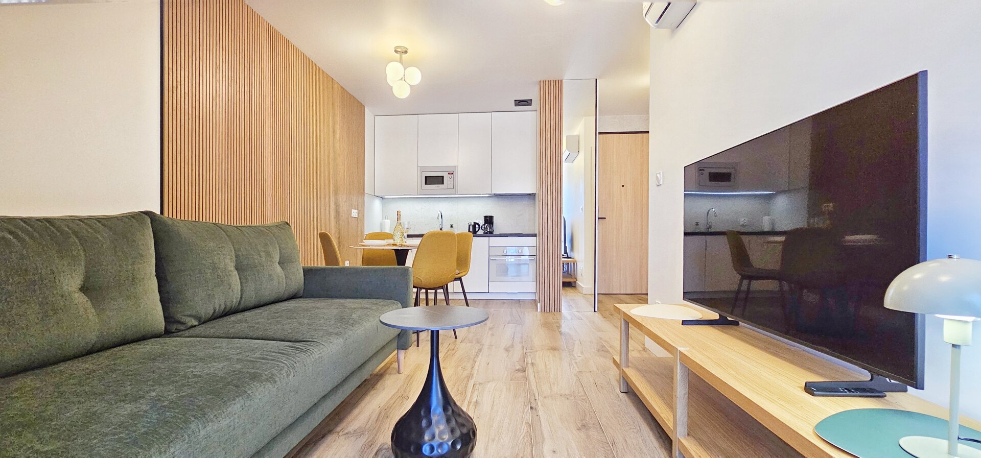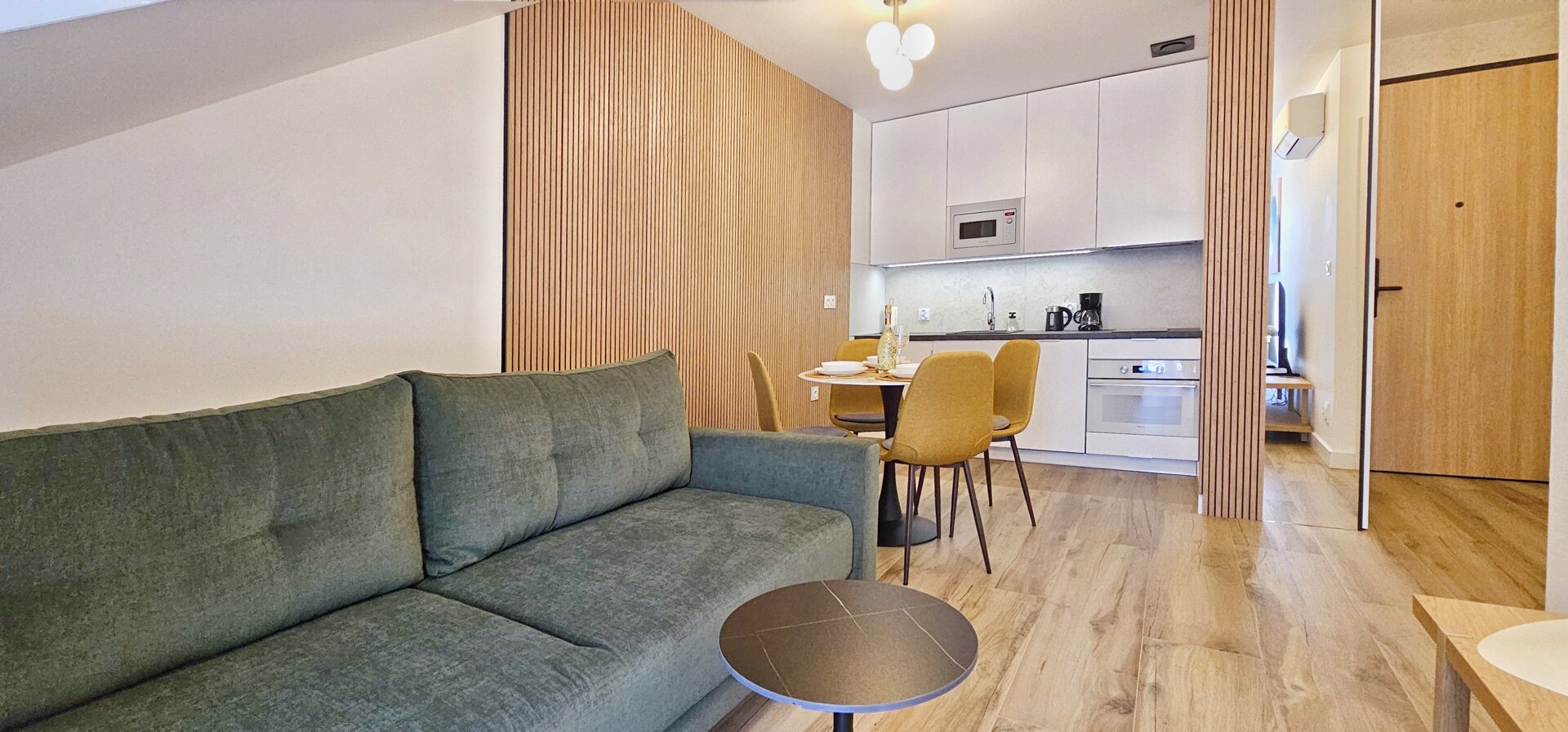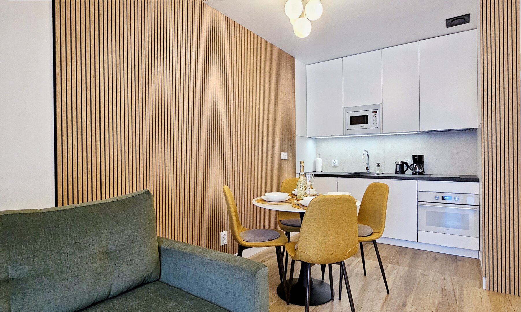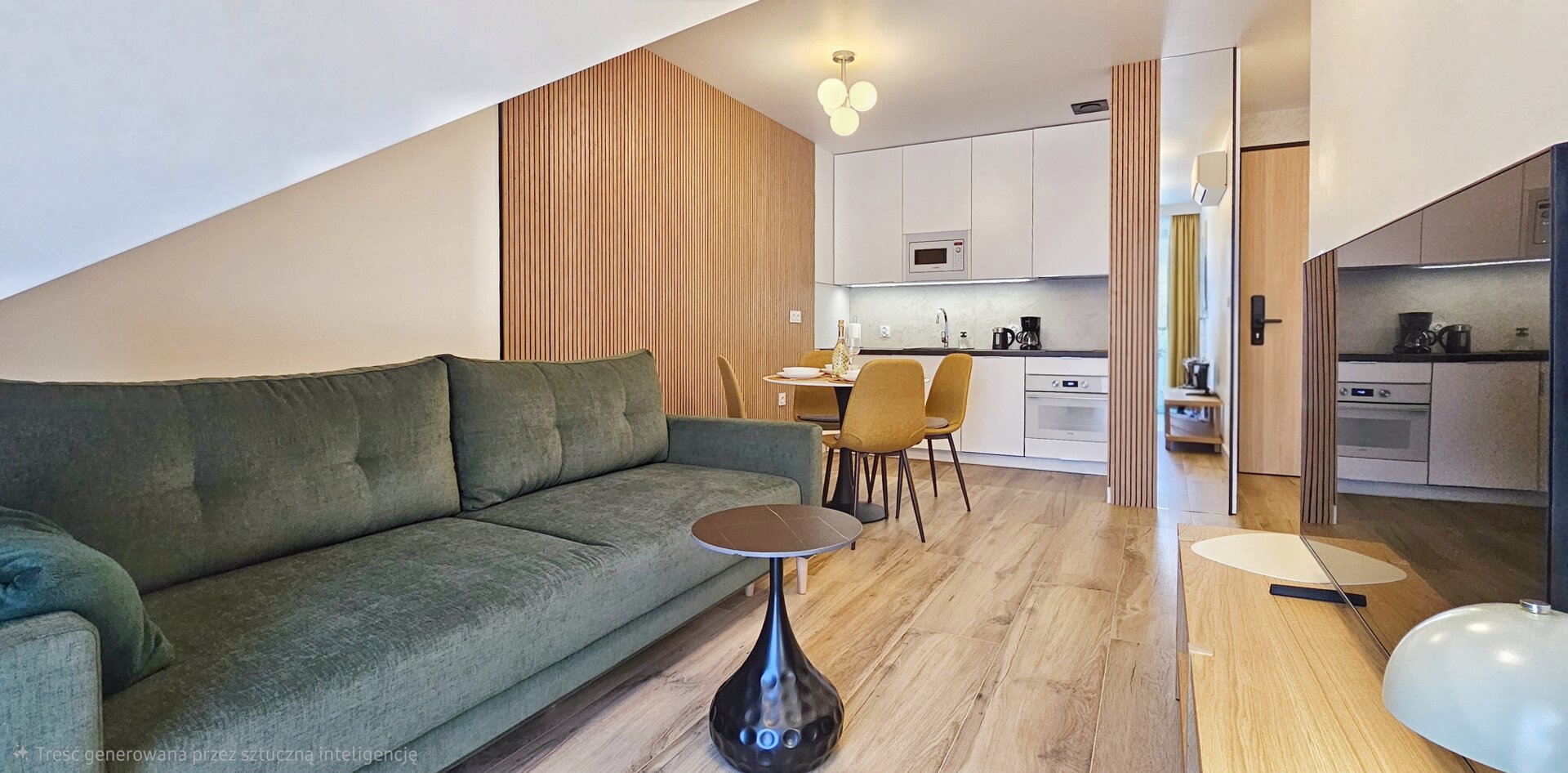 Aneks kuchenny w pełni wyposażony – m.in. płyta indukcyjna, lodówka, zmywarka, ekspres do kawy, przybory kuchenne.