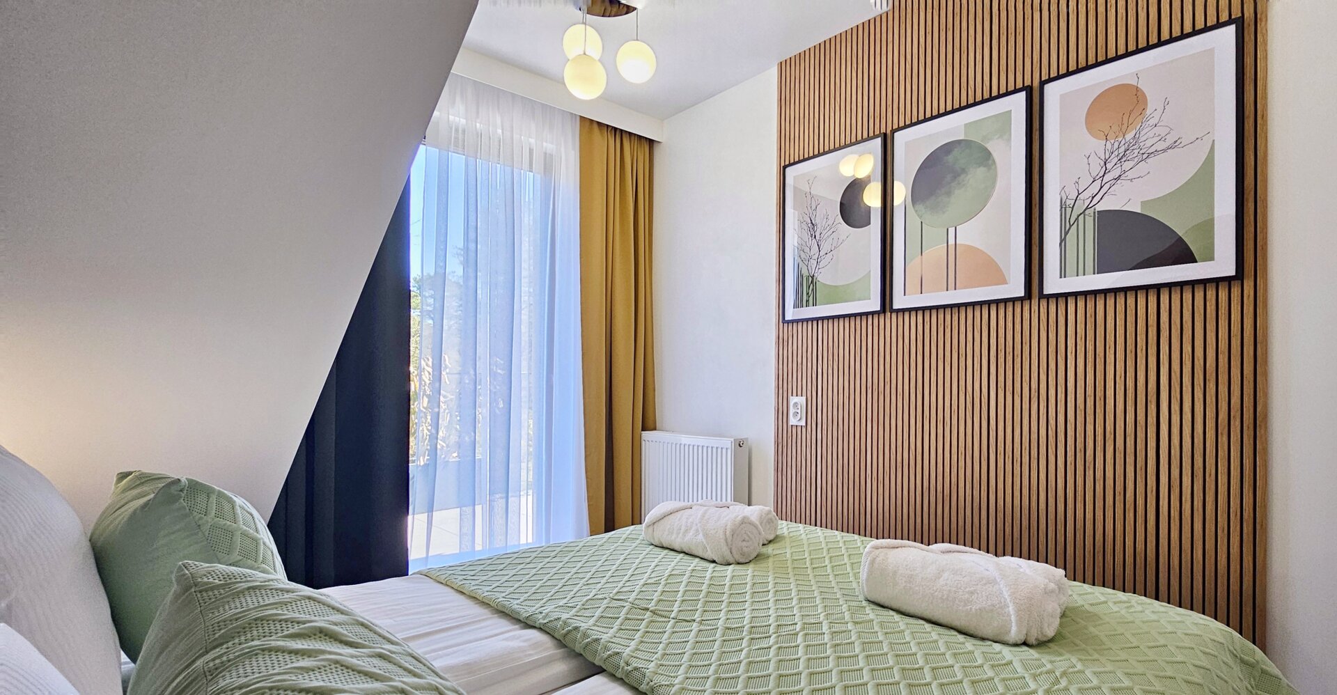 Apartament z dwoma sypialniami, aneksem kuchennym i podwójnym balkonem w nowym kompleksie apartamentowym.
