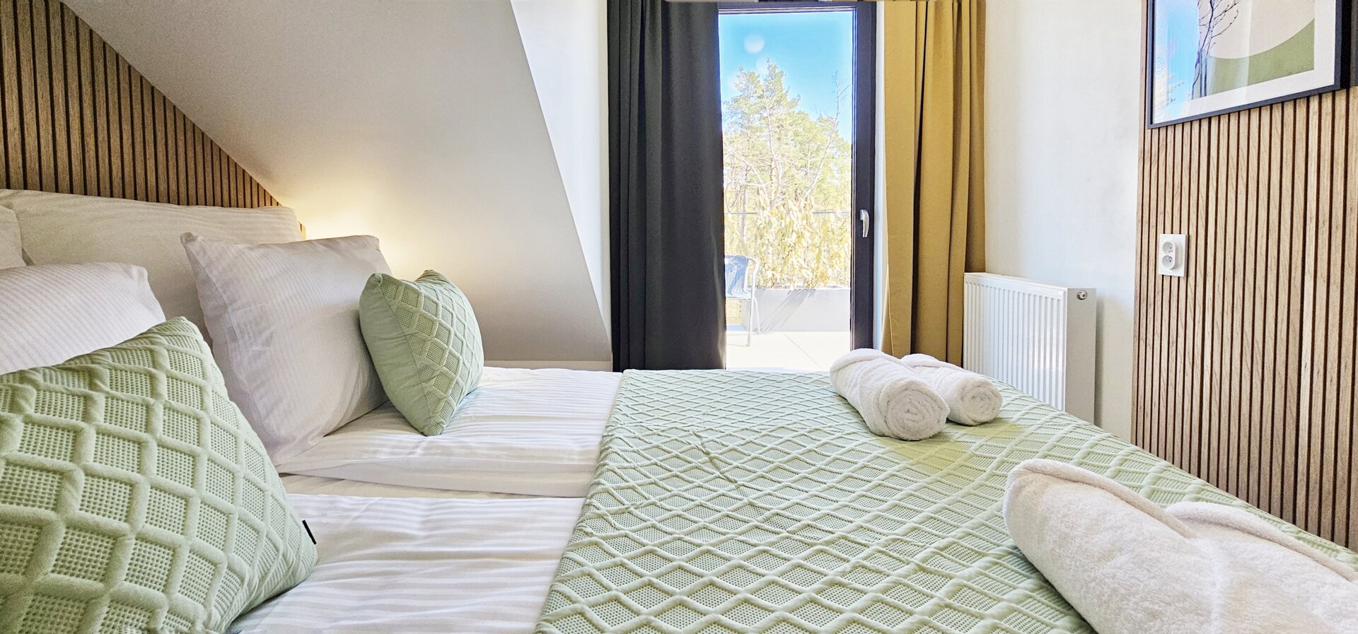Przestronny balkon z panoramicznym widokiem na Woliński Park Narodowy – idealny na poranną kawę lub wieczorny relaks.