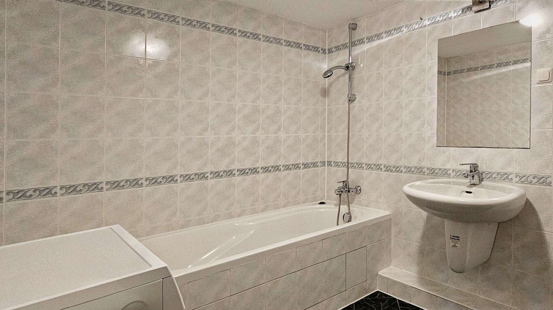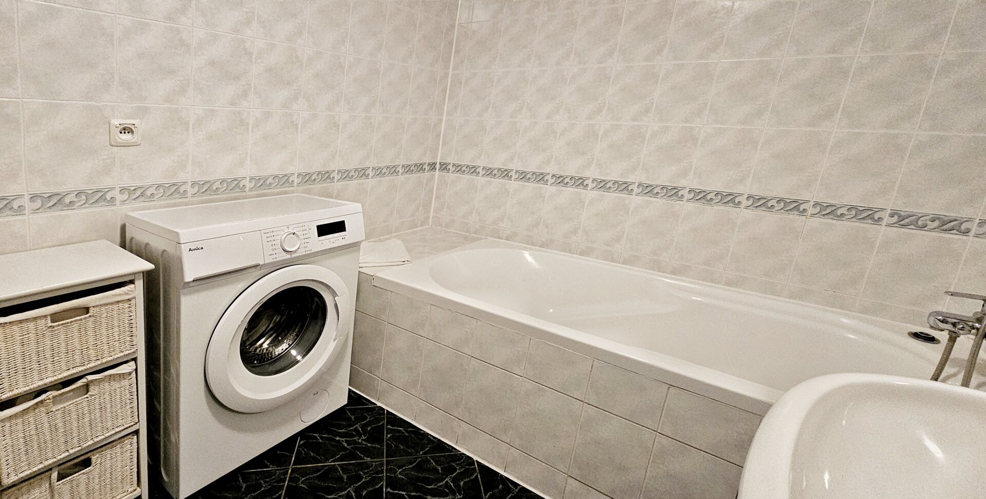 Łazienka w apartamencie jest wyposażona w wannę, który zapewnia chwilę odprężenia po aktywnym dniu oraz pralkę.